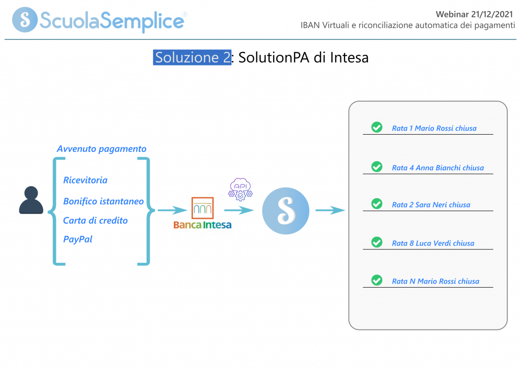 In questo articolo abbiamo illustrato cosa è e come funzione l’IBAN virtuale e come sia possibile con ScuolaSemplice assegnare un iban ad ogni cliente per poi registrare in automatico i pagamenti e chiudere le posizioni aperte di studenti e aziende clienti. Oggi invece parliamo di una ulteriore soluzione, sempre al fine di automatizzare il ciclio attivo dei pagamenti, tramite l’interconnessione di ScuolaSemplice con il sistema SolutionPA di Banca Intesa San Paolo. Per quanto quindi l’obiettivo sia sempre il medesimo, ci sono invece notevoli differenze sia per la scuola sia per lo studente che effettuerà i pagamenti.