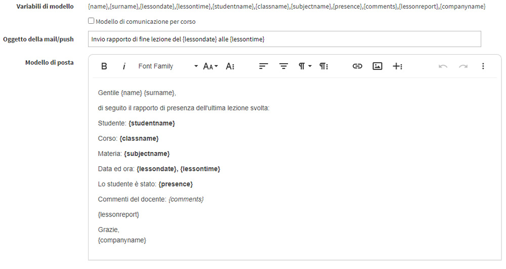 Model variables (placeholders) relating to personal data, courses and payments can also be used, so that the data contained in the messages can be dynamically enhanced based on the context and recipients. Custom communication templates can be created, which can be used for recurring communications.